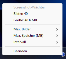 - Per Klick auf das Symbol lassen sich Screenshot-Intervall, maximale Anzahl der Screenshots im Verzeichnis und/oder maximaler Speicherverbrauch der Screenshots festlegen, sowie den ScreenshotWächter beenden